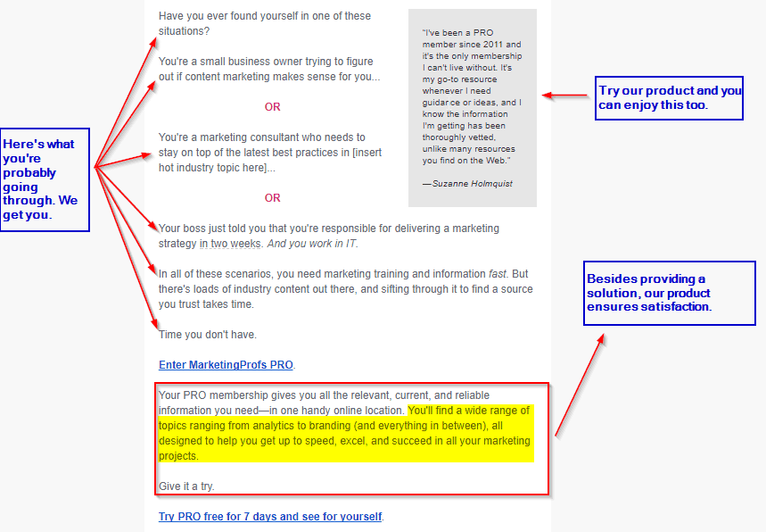 - An explanation of the solution the product provides: …PRO membership gives you all the relevant, current and reliable information you need — in one handy online location. That is coupled with the satisfaction that comes from it — highlighted in yellow marker: You’ll find a wide range of topics ranging from analytics to branding (and everything in between), all designed to help you get up speed, excel and succeed in all your marketing projects.