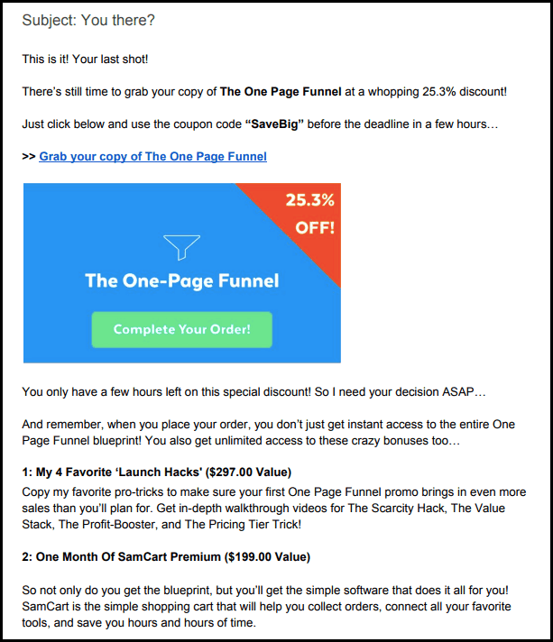 Email copywriting veteran Ben Settle, who’s popularly known for blatant sales pitches in his newsletters, puts it this way (in a recent newsletter):