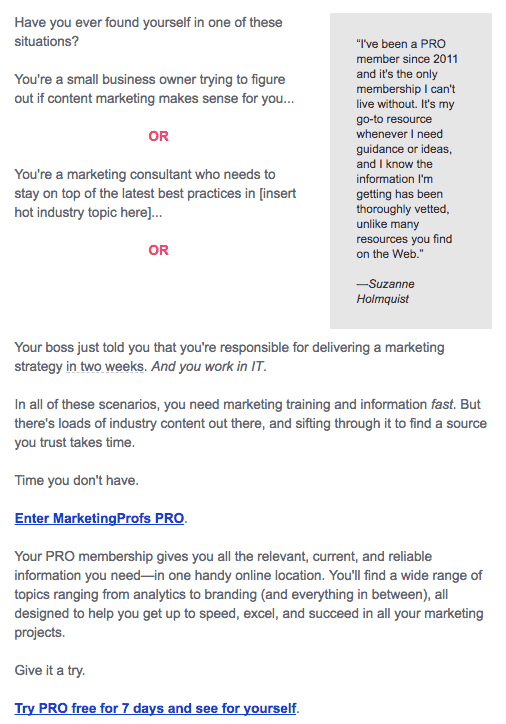 This email has virtually everything needed — empathy, proof (testimonial), and a clear communication of value — to convince marketers they can benefit with MarketingProfs’ product.